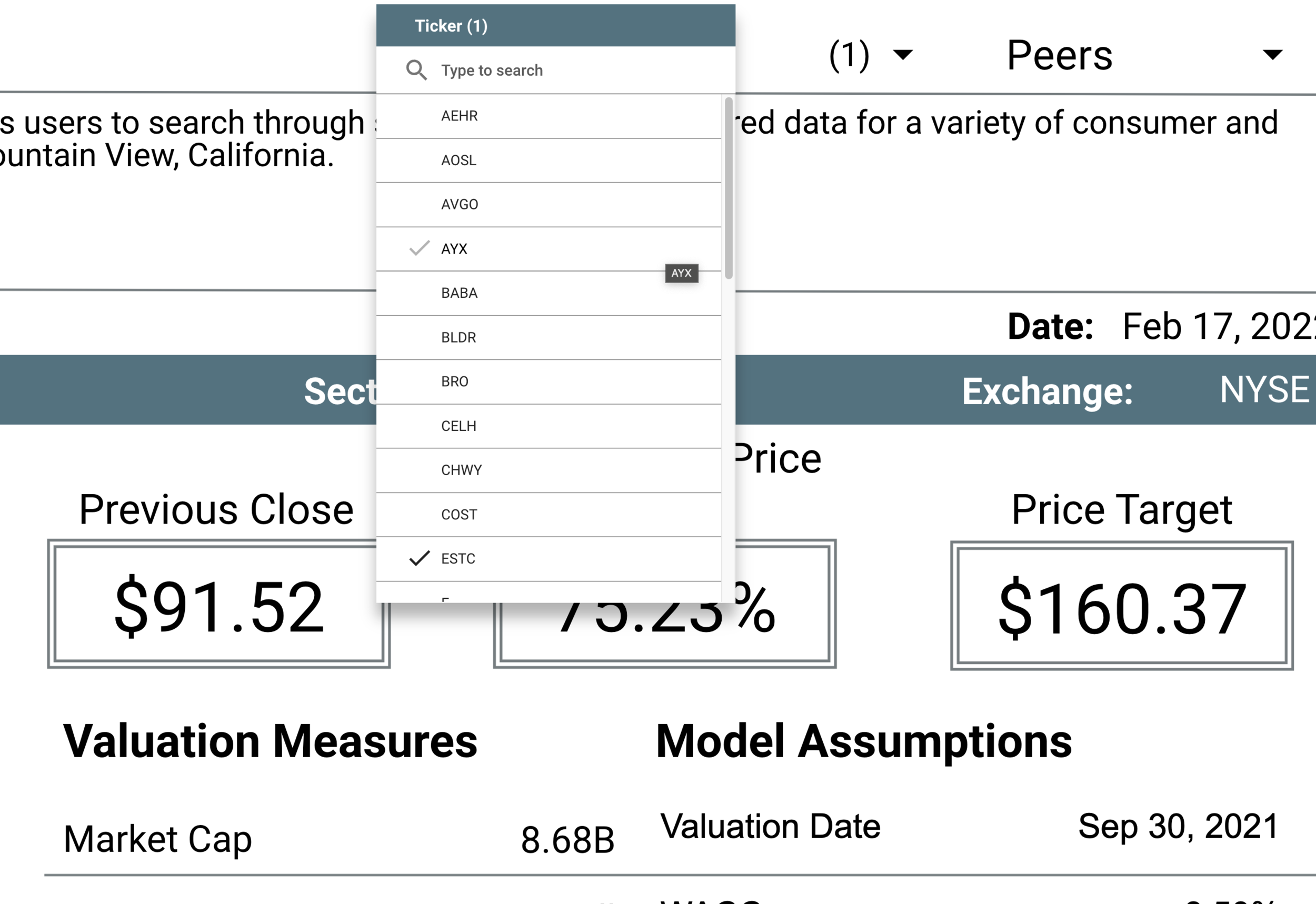 Select the Ticker that corresponds to the company you have researched from the drop-down menu. Next, select the group of companies that you consider to be comparable in terms of sector / industry / metrics. Remember, in the Ticker field, you can only select companies in your Portfolio or Watchlist. If you can’t find the company you are looking for, add it to the Watchlist, then click the Update Watchlist button and wait at least 15 minutes for the system to refresh.