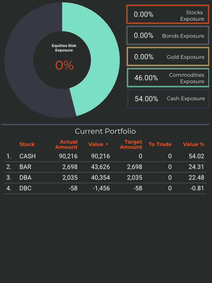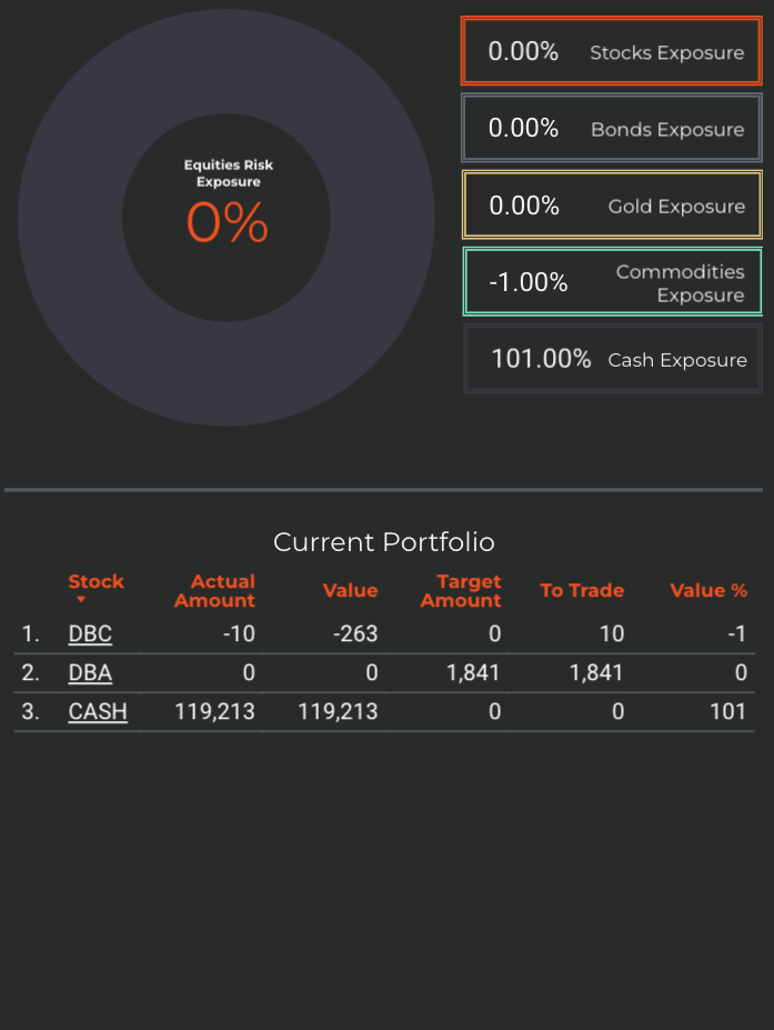 The strategy will aim to decrease exposure to commodities on the next available SELL signal. The decrease will be significant, almost halving the current position after the rally.