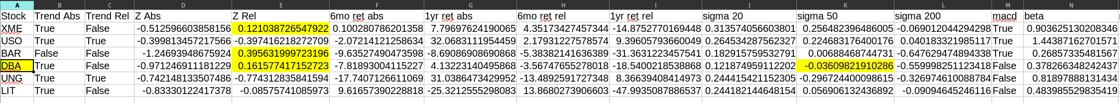 The next step is determining where the opportunity to trade lies in the medium term. We look at the Sigma 50 column and find Negative values (in order to “buy the dip in what is otherwise a relative out-performer). The ETF that fits both criteria (positive Z-Relative AND negative Sigma 50) is DBA, the ETF for agricultural commodities. It will serve as the only position that Nostromo will target for allocation.