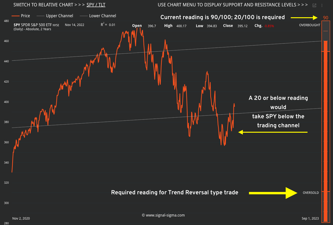 The second principle that we are looking for is to “buy the dip”. In order to isolate a trend reversal point, we use several filters. The first one is the Overbought/Oversold indicator that you see on every chart on the right side. This has to read 20 or less, in order to qualify for a trend reversal trade. For SPY, the current reading is 90/100. There is a long way to go until we reach 20 or less, and by that point, we would be outside the trading channel anyway.