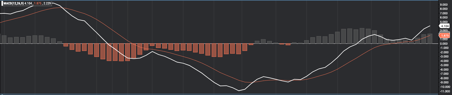 The trend continuation principle aims to buy securities that are coming out of a recent consolidation pattern. We use a MACD cross Signal to identify these opportunities. Right now, for SPY, here is how the MACD signal looks like: