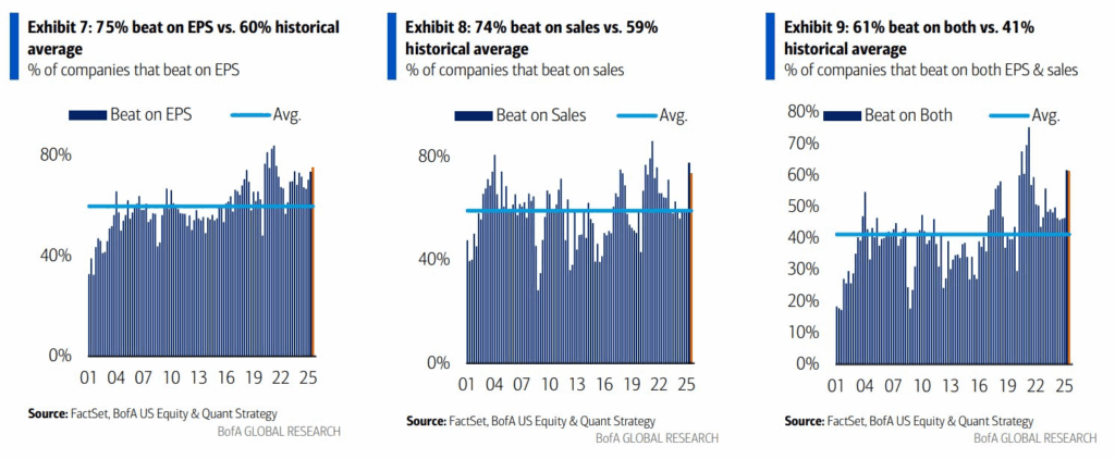Fundamentally, while expectations heading into Q3 were low, most of the bearish concerns have been laid to rest. Over 75% of companies beat estimates, 74% beat revenues, and 61% beat on both in Q3 Earnings Season. More importantly, profit margins did not collapse, which was the main tariff-related fear.