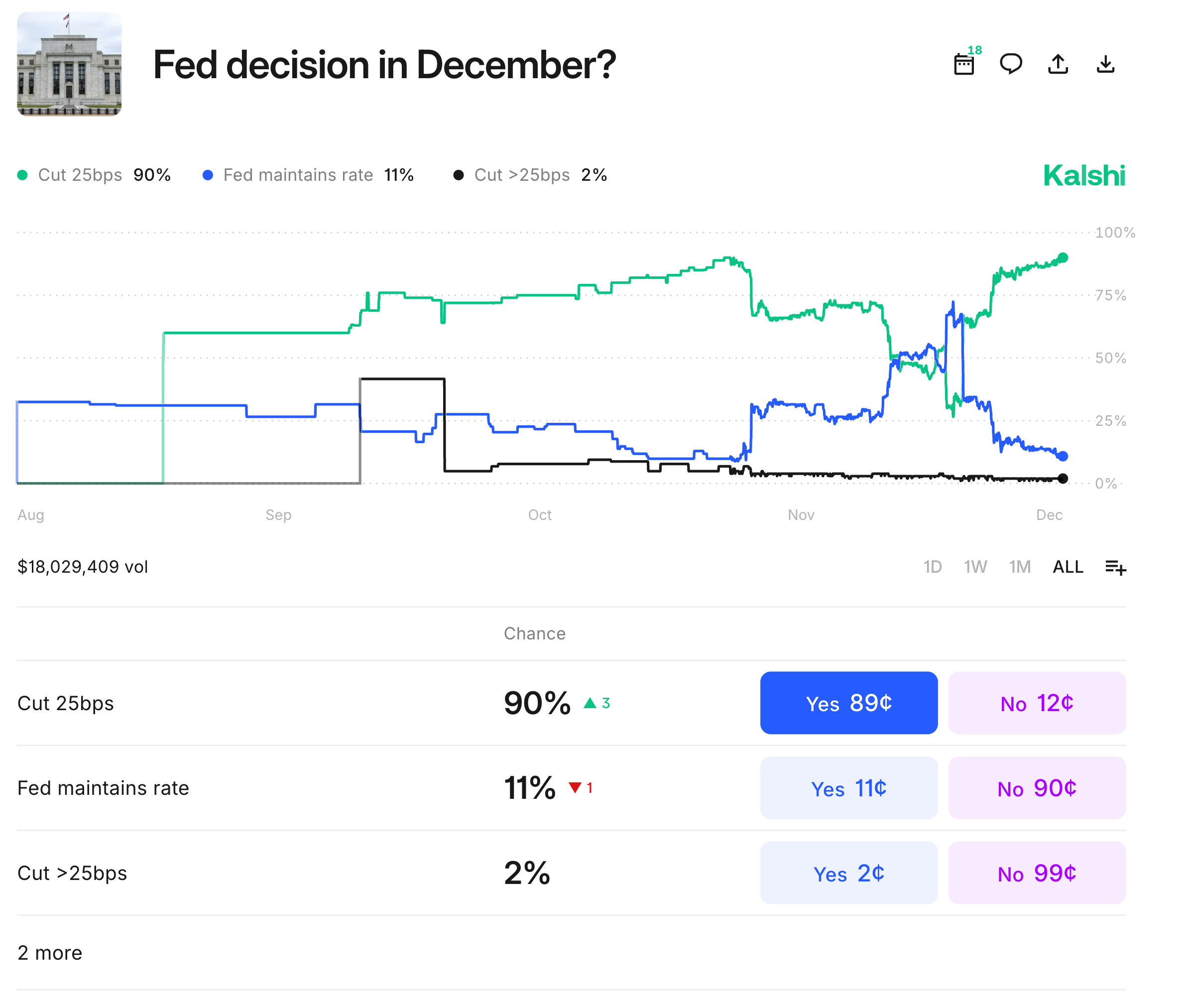 Besides “the dip” providing an entry point opportunity, the main catalyst were falling bond yields and an increasing perception that the Fed is due for another round of easing in December. Currently, prediction markets are pricing in a 90% chance of a rate cut at the December meeting next week.
