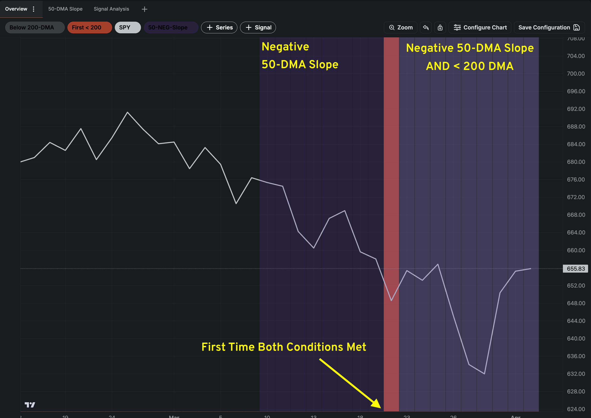Another revealing study involves the behavior of markets around the key 200-day moving average, especially in conditions where this acts as broken support. It turns out that whenever the 200-DMA is violated, while the 50-DMA is also sloping downward, short term returns skew extremely bearish.