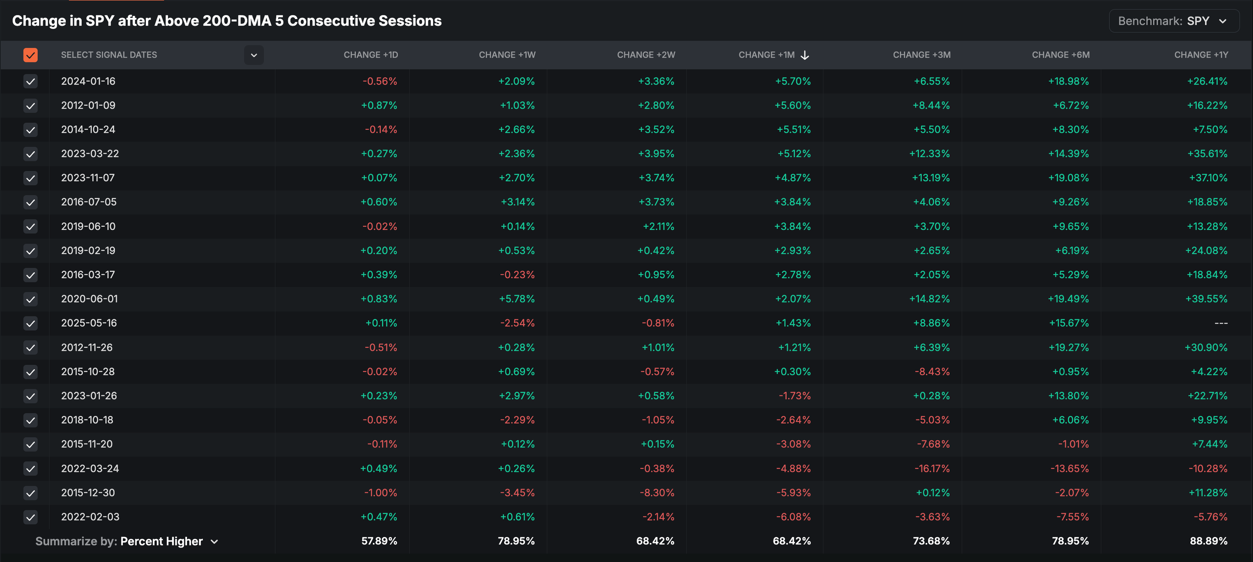 As shown in the study below, once we get a clear confirmation that SPY has traded above the 200-DMA for 5 consecutive sessions, odds for returns improve greatly at all time periods.