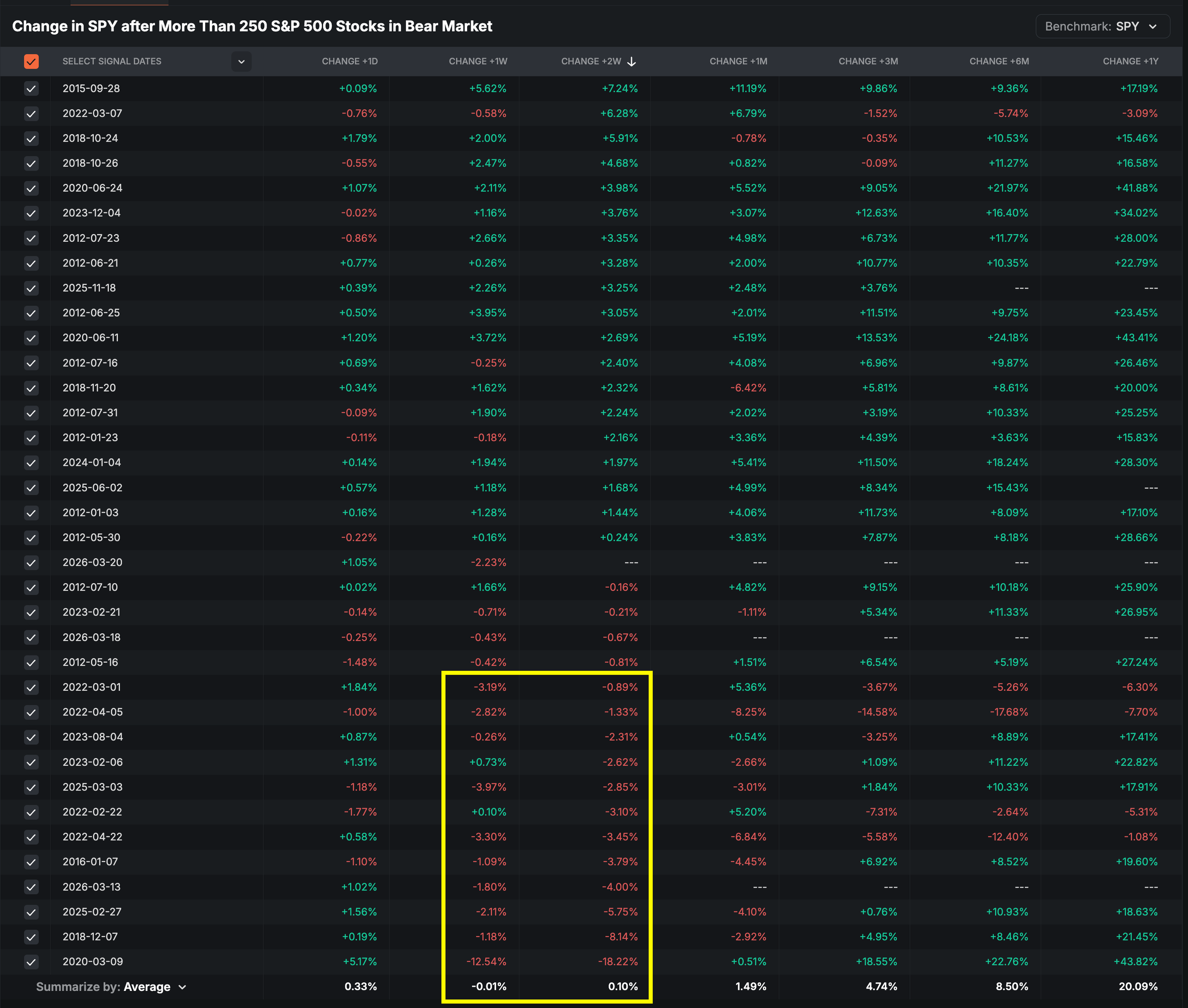 However, the 1 and 2 week intervals can bring further losses up to -18% for SPY. In other words, betting on the market in the very short term tends to be risky, while this becomes a non-issue in the longer term. The table below is revealing as it tells us significant losses are clustered in the near term.