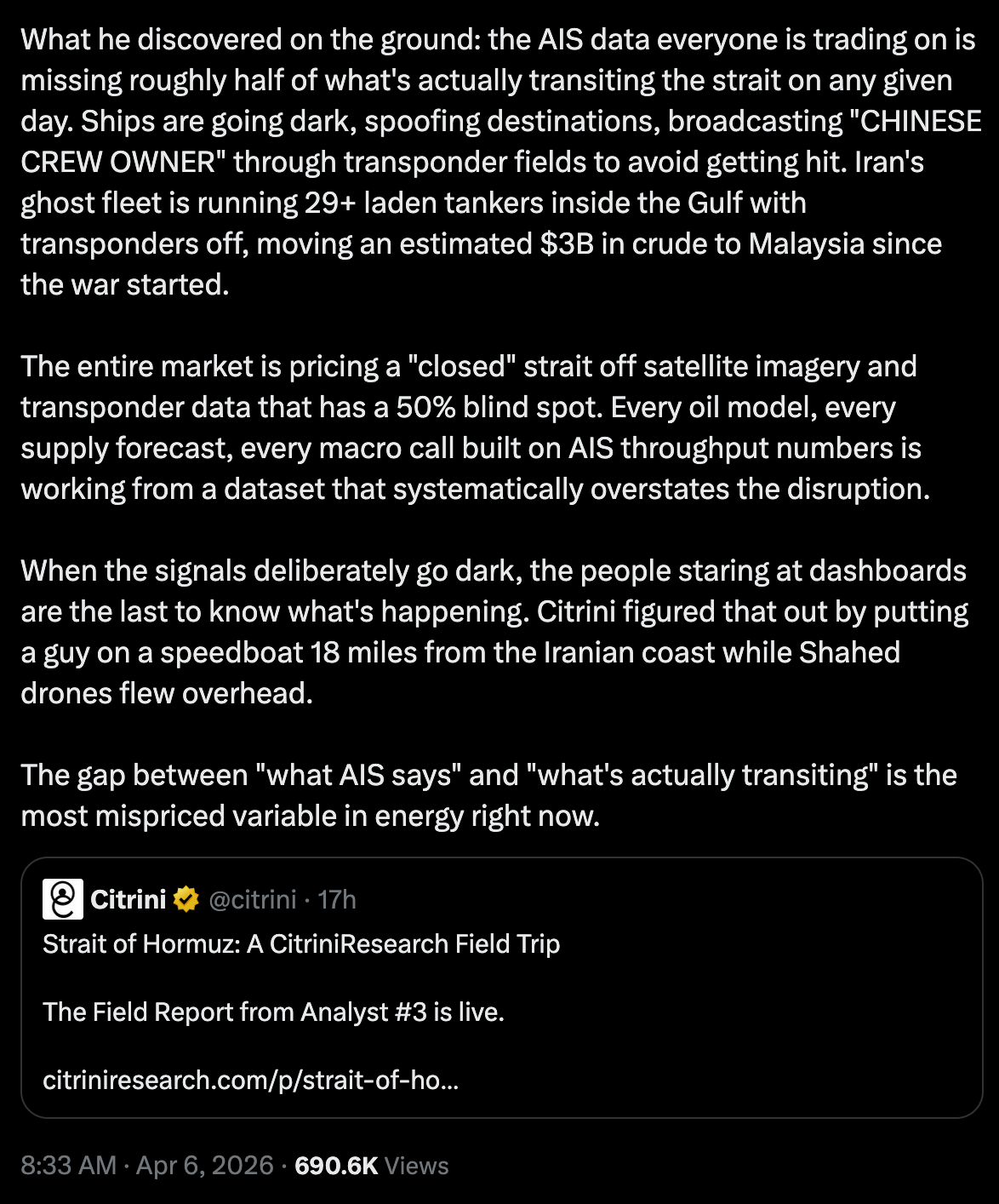 A potential silver lining rests in a rumour we’ve been hearing over the last couple of weeks, apparently confirmed by Citrini research: the Hormuz Strait is not nearly as “disrupted” as currently perceived by investors. Citrini sent an analyst with $15,000 in cash, recording sunglasses, and a pack of Cuban cigars to the Strait of Hormuz in order to gain intel on what the ground situation really looks like. He discovered a stark difference between tanker reality and press headlines.