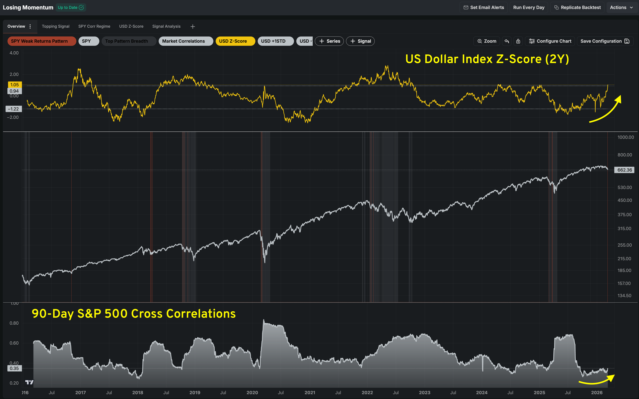 US Dollar (UUP) Absolute Z-Score 2Y — Yellow, upper graph