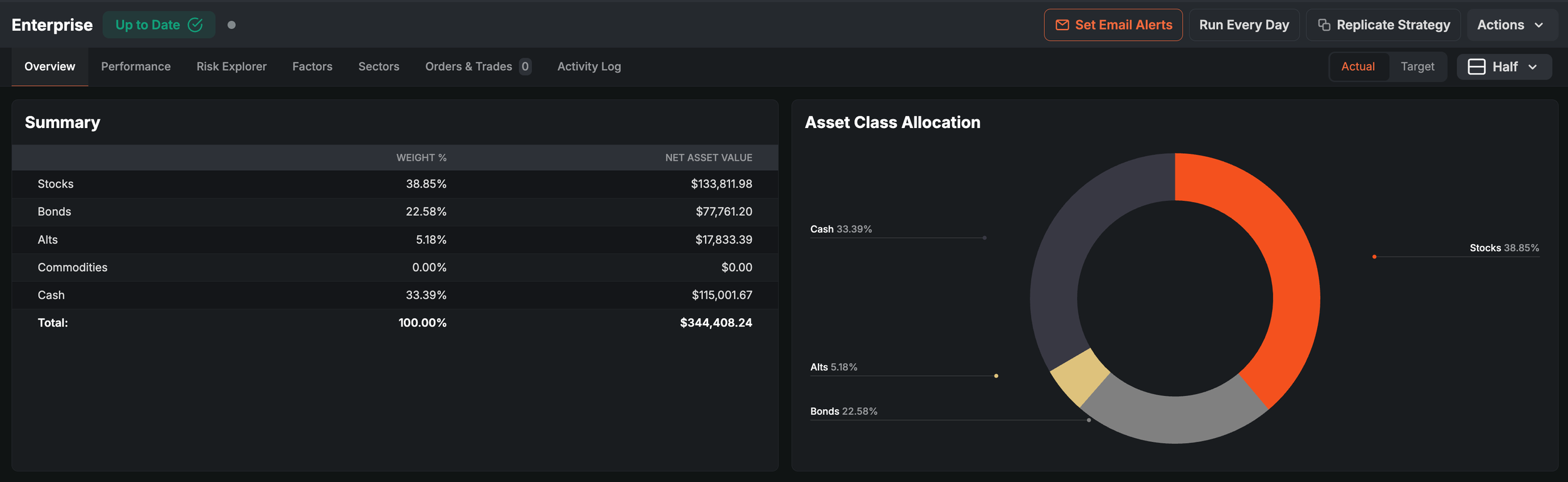 The Enterprise Strategy, due for rebalancing tomorrow, is sitting 33% in cash, which is quite a defensive position. At just 40% of NAV, stocks exposure is conservative.
