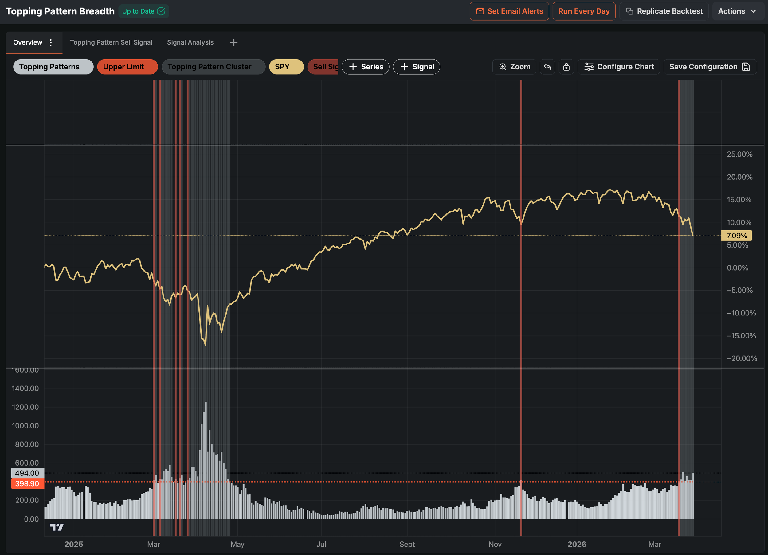With no BUY signal yet triggered, stocks fell for the 5’th consecutive week. Short term, the market is oversold enough to elicit a strong rally on any piece of good news. However, we are now firmly inside a SELL signal cluster triggered by our topping breadth backtest. Historically, we would need to see the market come out of this pattern, with the number of technically damaged stocks going well below 400 (currently 494).