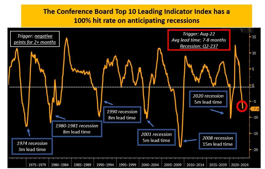 The Leading Economic Index (LEI), includes the top 10 most impactful forward indicators for the US economy. Historically, every time the year-over-year series of the LEI falls into negative territory for two or more consecutive months, it signals the onset of a recession.