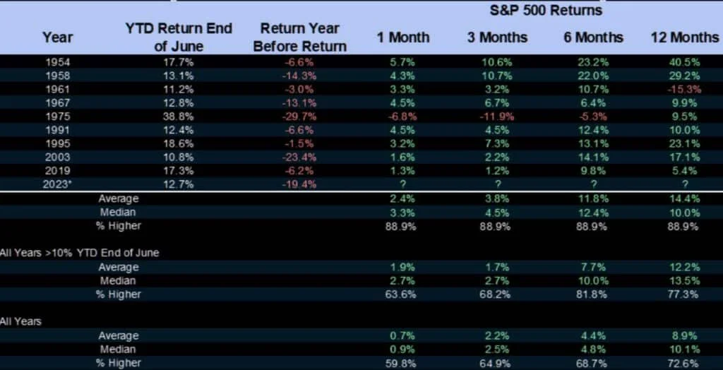 This is an environment where equities will be supported by a fairly strong bid, even when sentiment turns. Our thinking is to use a “regular” 5-10% correction, in the $431 - $419 price band to add exposure to portfolios. Second half returns tend to be strong, when the market is up 10% in the first 6 months.