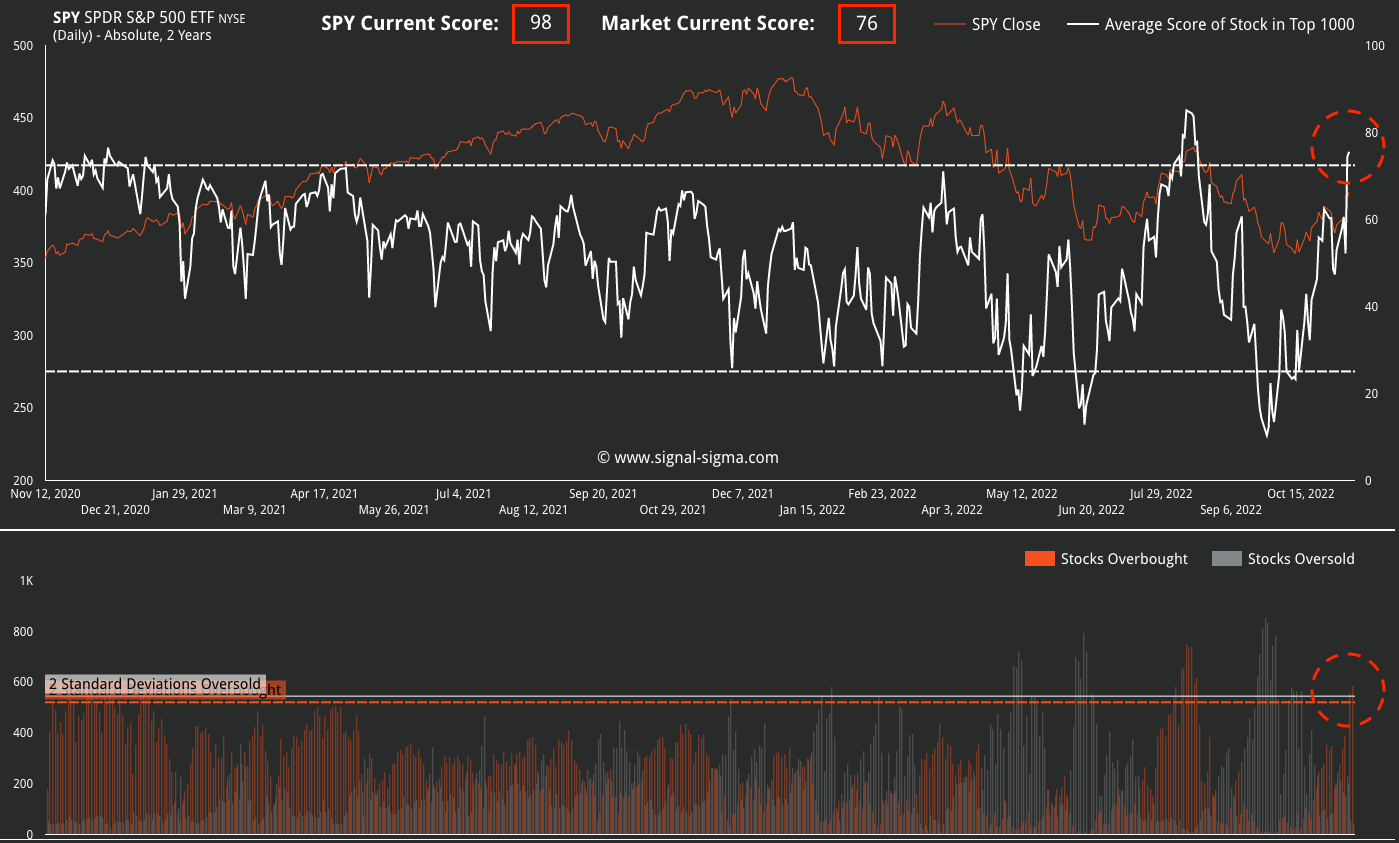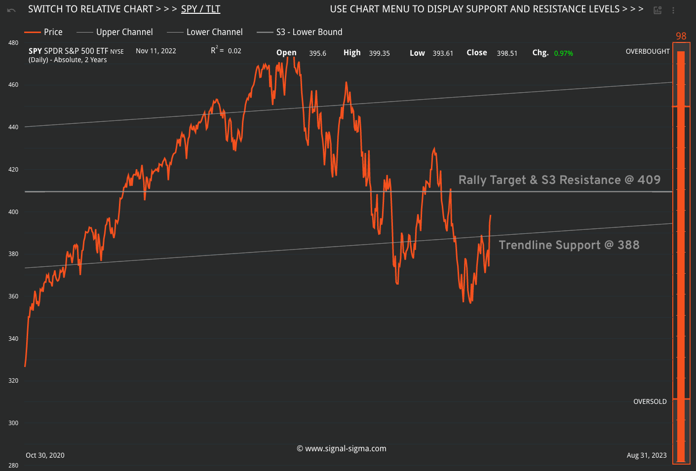 Note the fact that the 2-Stdev Oversold line is still higher than the 2-Stdev Overbought line, a significant difference to the August rally.