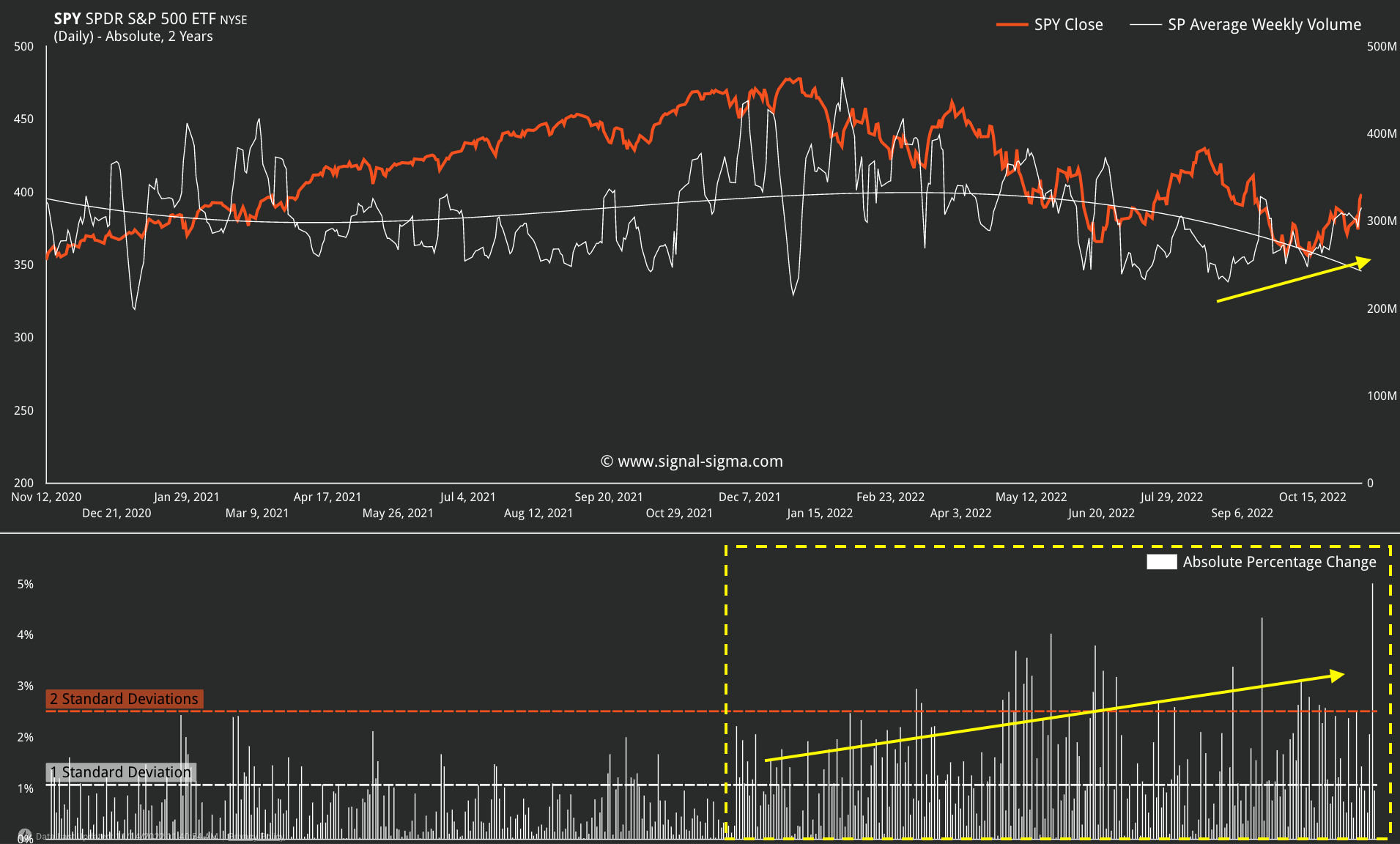 On the volume side of the equation, we are seeing rising transaction dollar volumes accompany this rally (which is good news for bulls, since it shows that not only short covering has occurred post inflation print, but also new long positions have been initiated). However, the huge percentage change associated with the move is NOT a good sign, since it perpetuates the high volatility regime we have been facing since November 2021.