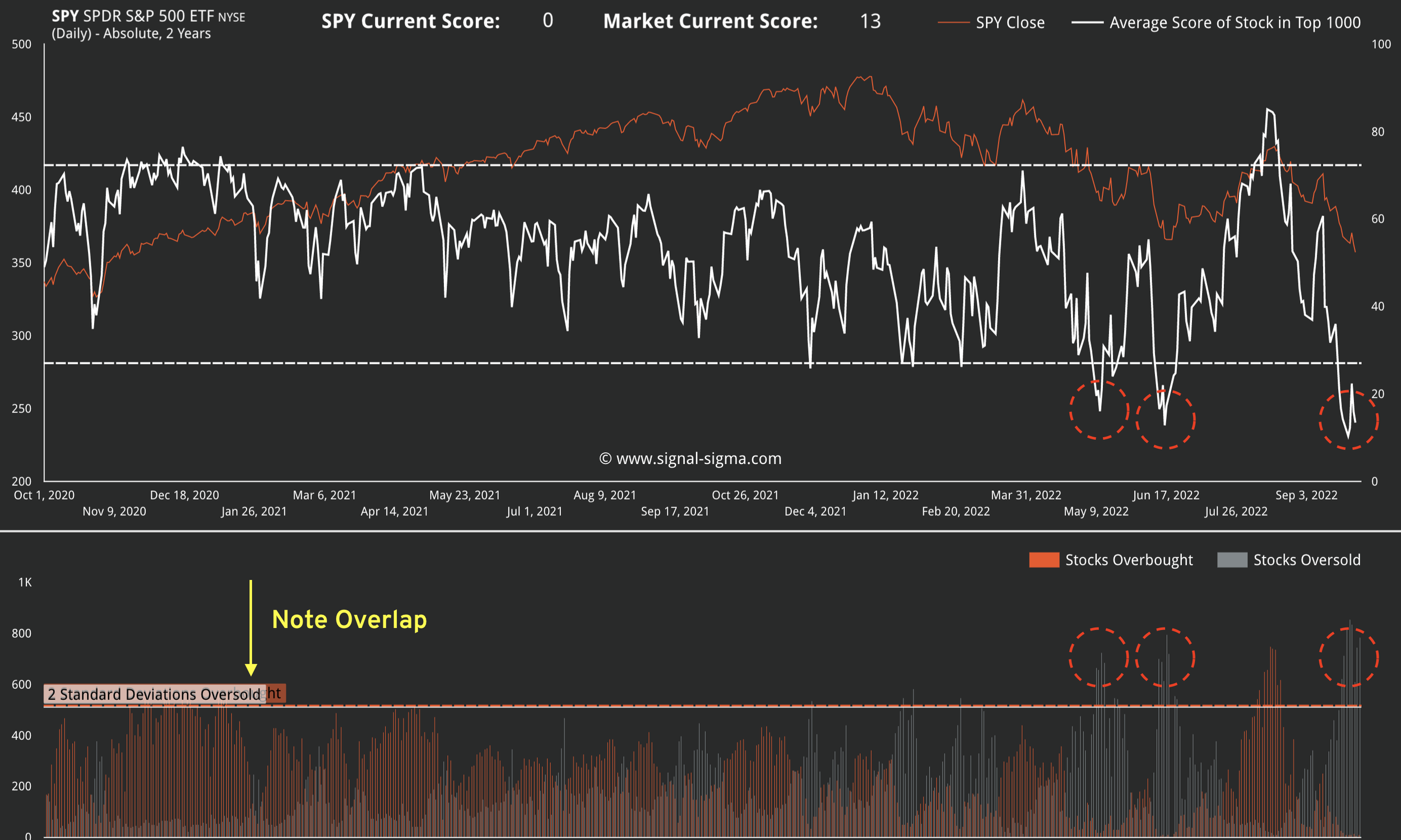 The average score for a stock in the top 1000 by volume is 13.45 / 100, as measured by our Market Internals Instrument. This is consistent with previous short term bottoming processes that occurred in May and June.