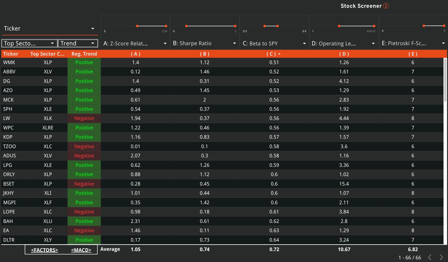 We have highly competitive list so far that can be further enhanced according to your particular requirements. In our case, we will select low volatility and high Operating Leverage, a potent combination of factors in the current environment: