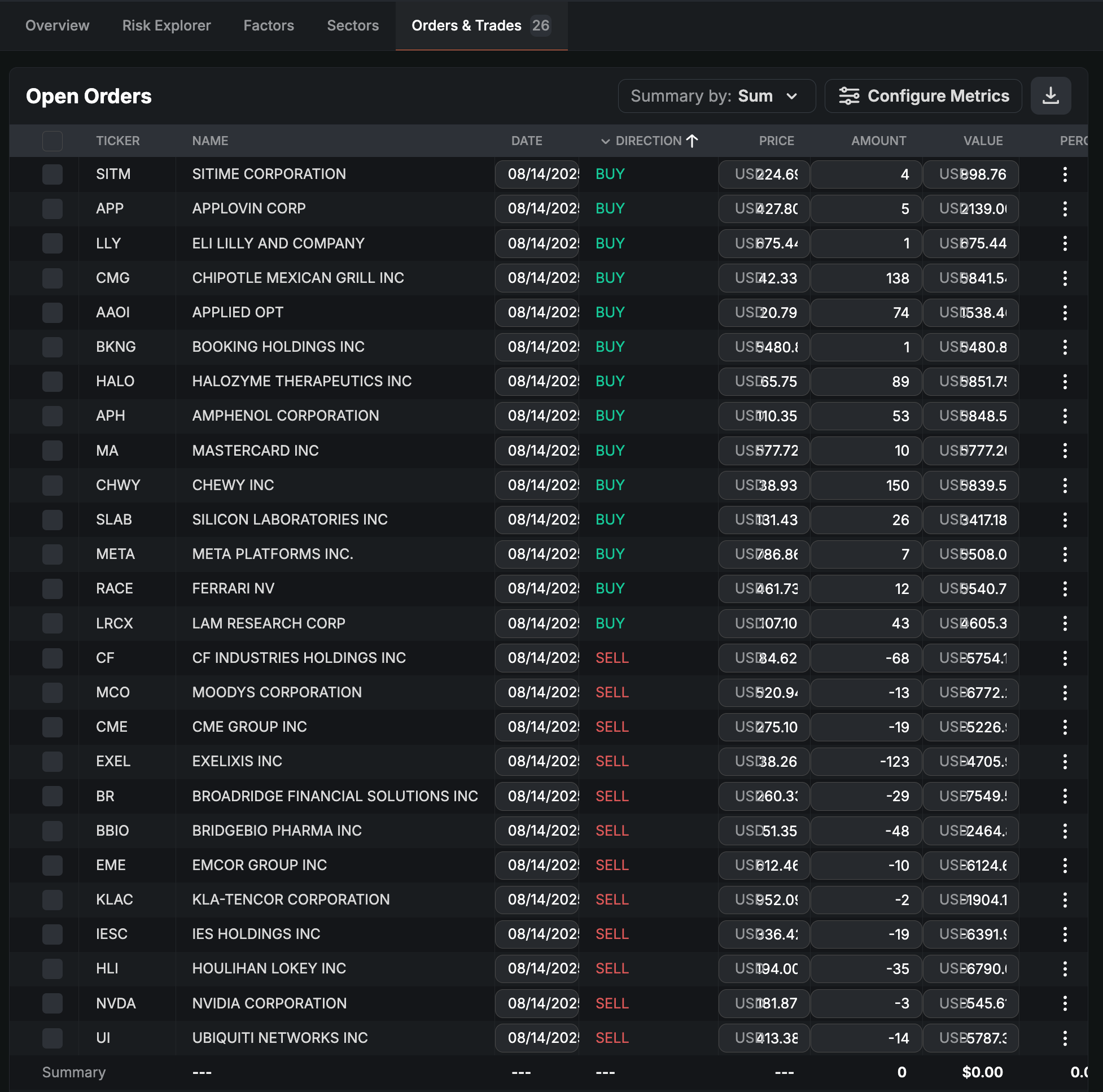 At the end of the process, we’ll get a full list of BUY and SELL orders which we may execute at our discretion. For the Sigma Portfolio simulation purposes, we will just execute all orders at market close, but the real-life application will probably take around 10 days.